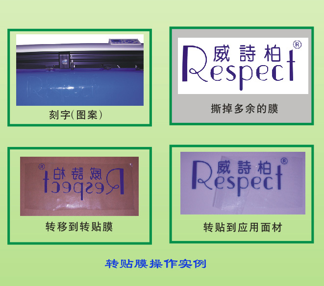只需將轉貼膜在切割好的圖案或文字上面一貼就能全部將圖案文字輕輕松松轉過來,然后再貼到您要貼的地方就好了,非常方便。根據粘合力和基材的不同,有粘度及尺寸規格選擇